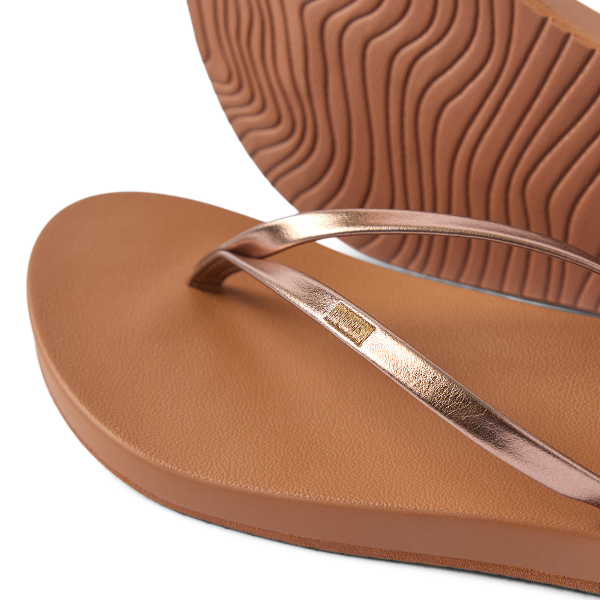 A delicate embroidered gold detail and slim straps transform our classic Cushion Slim flip flops. Just as comfy. a touch more chic. With a vegan leather strap. high energy rebound footbed and anatomical arch support.