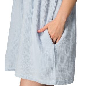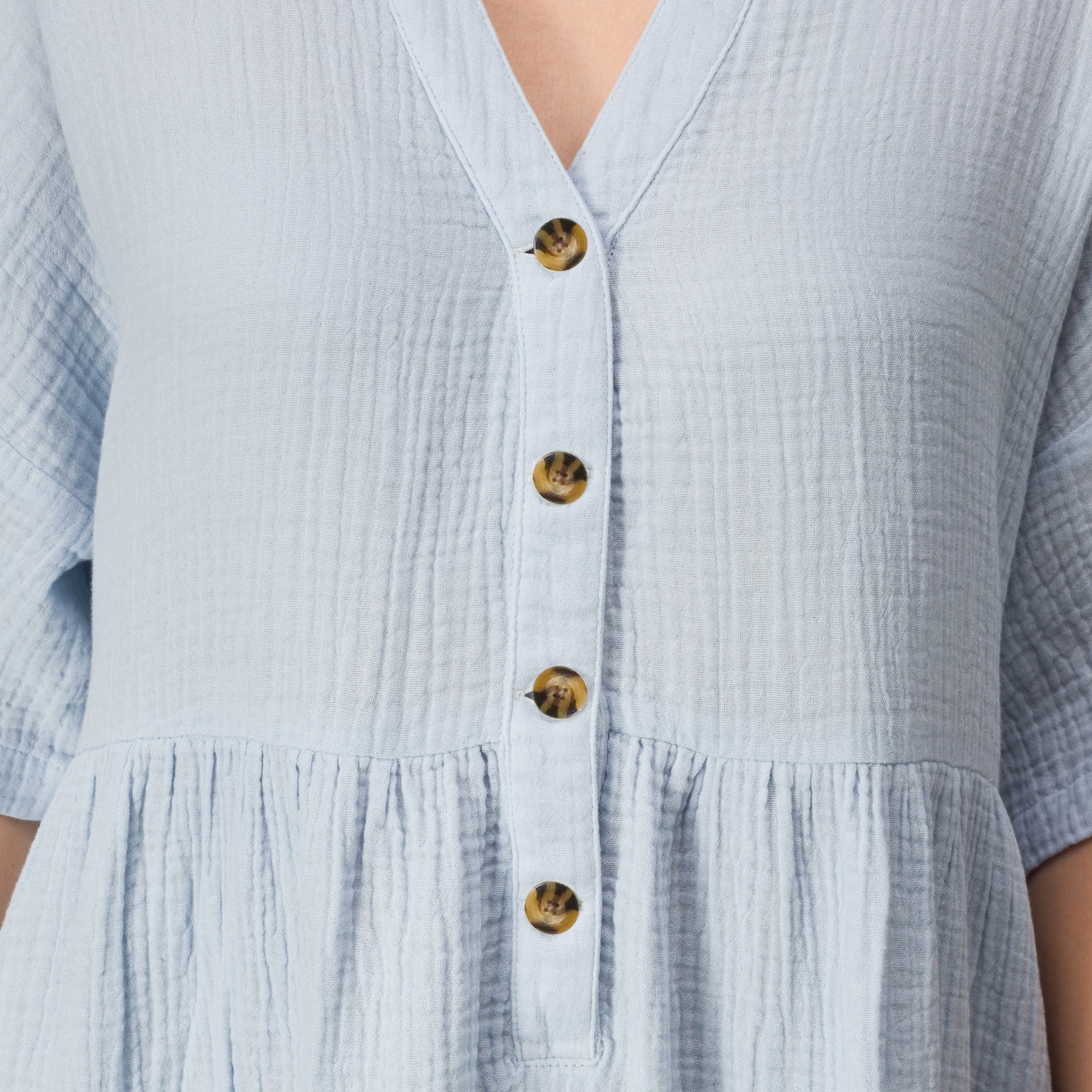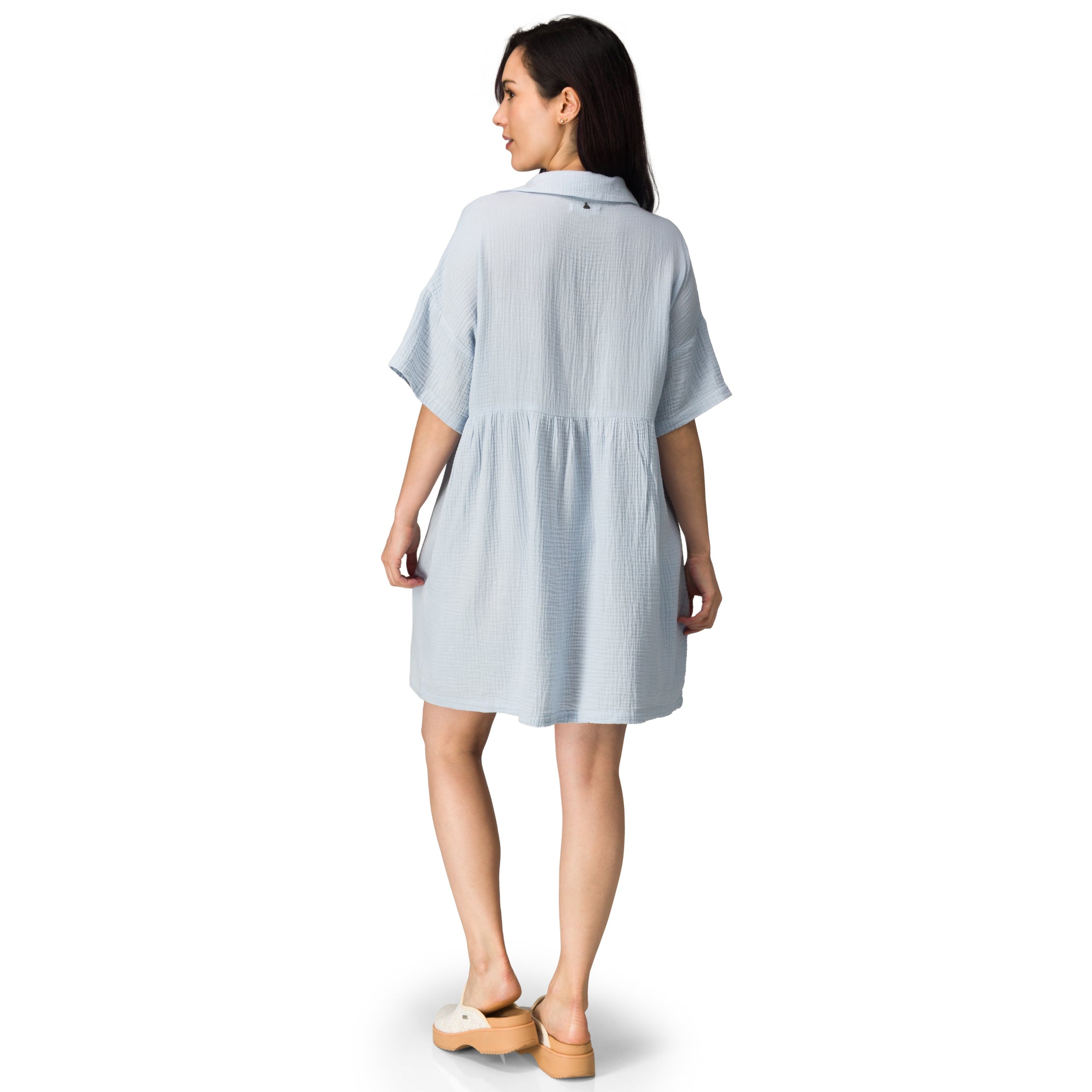 Easy. breezy. and made for everyday wear. the Lainey Shirt Dress blends relaxed comfort with effortless style. Crafted from soft double gauze woven fabric. it offers a lightweight. breathable feel with a gently textured hand. The collared neckline and v-neck placket create a clean. casual look. while the boxy silhouette and relaxed fit allow for easy movement and all-day comfort.