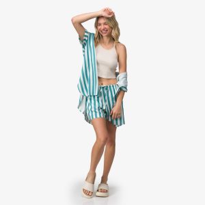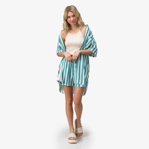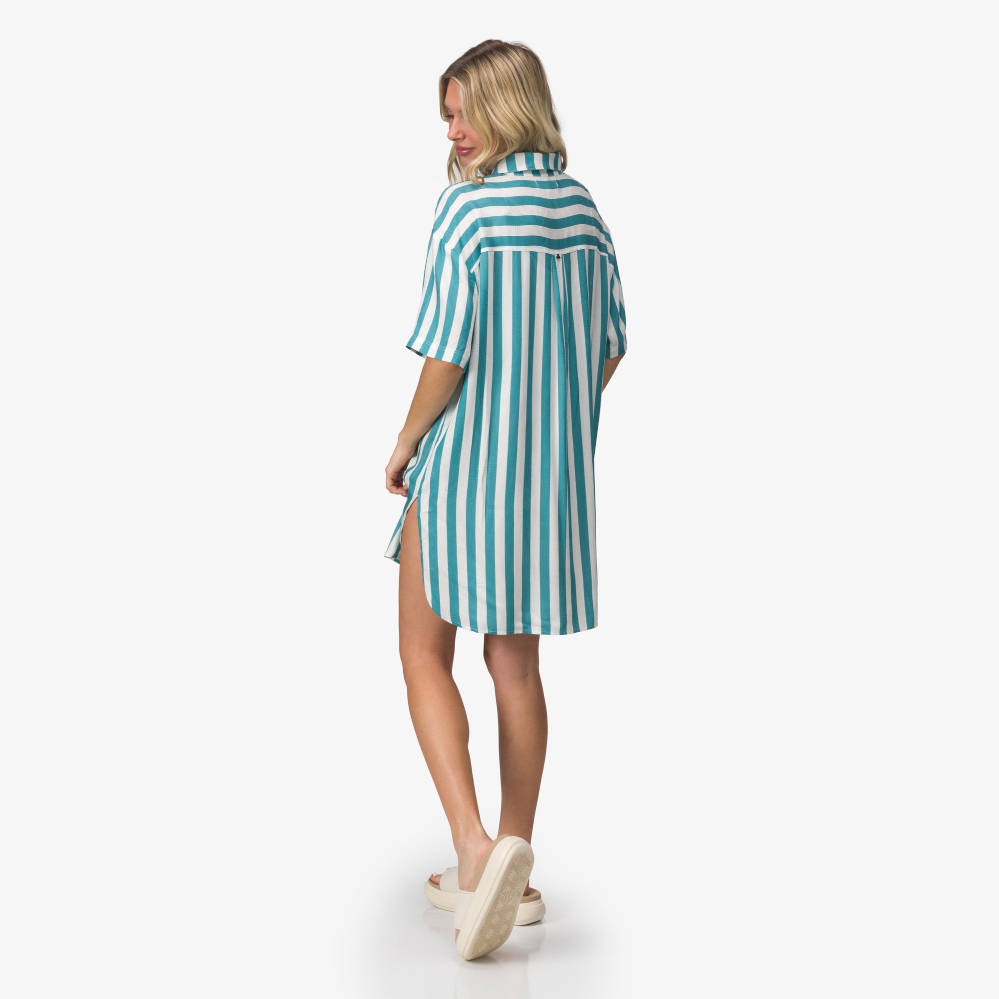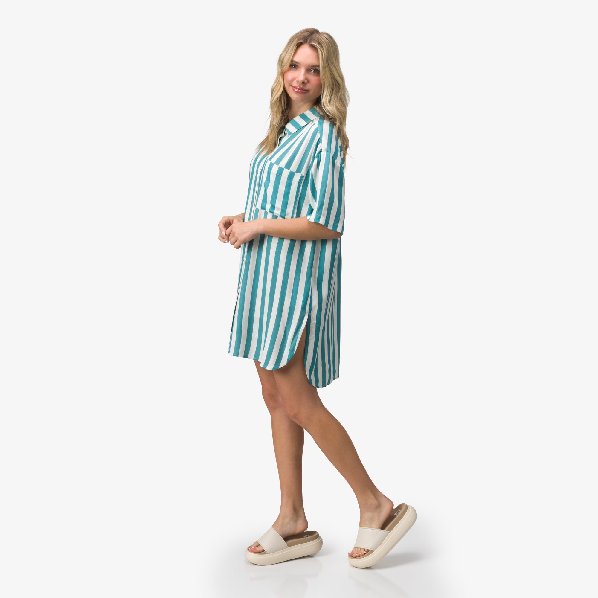 Easy. effortless. and made for sun-soaked days. the Striped Ollie Shirt Dress brings laid-back coastal style to a classic button-up silhouette. Crafted from lightweight woven fabric with a breezy striped pattern. it offers a soft. airy feel that’s perfect for warm weather. The oversized fit with dropped shoulders gives it a relaxed look. while the curved hem and side slits add movement and an easy. flattering drape.